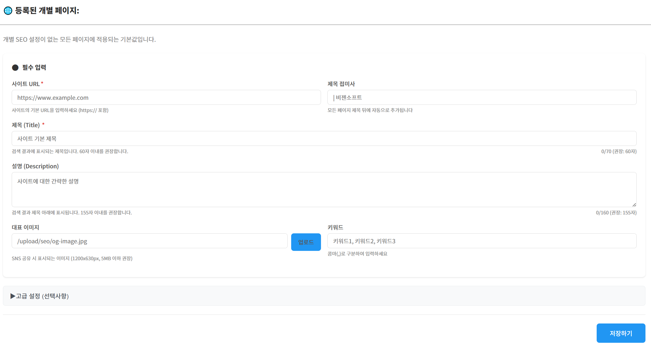 사이트 제목, 설명, 대표 이미지, 키워드 등 전체 사이트에 공통으로 적용될 기본값을 설정합니다. 이 한 번의 설정으로 모든 페이지에 기본 SEO가 적용됩니다.