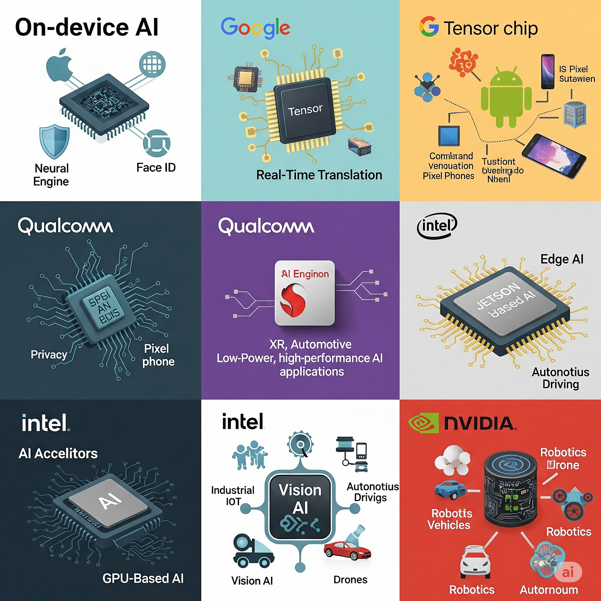 애플 (Apple): 아이폰, 아이패드, 맥 등 자사 기기에 최적화된 AI 칩셋(Neural Engine)을 개발하여 온디바이스 AI 기능을 강화하고 있습니다.