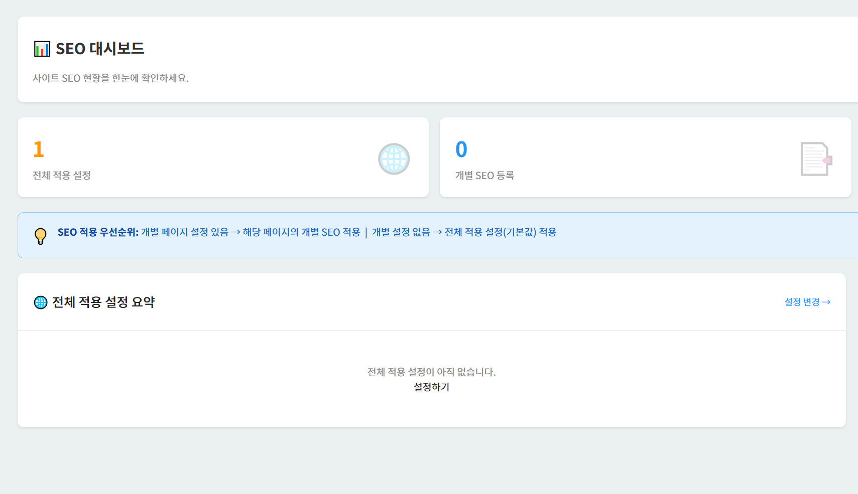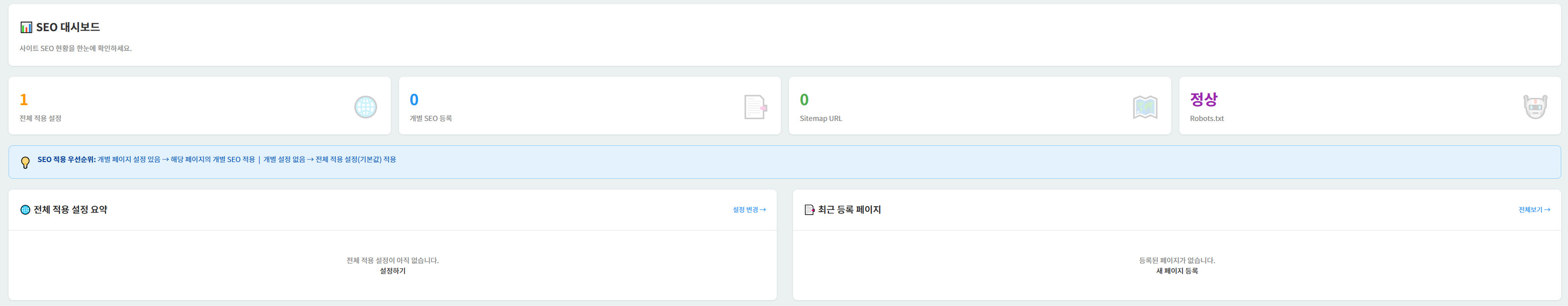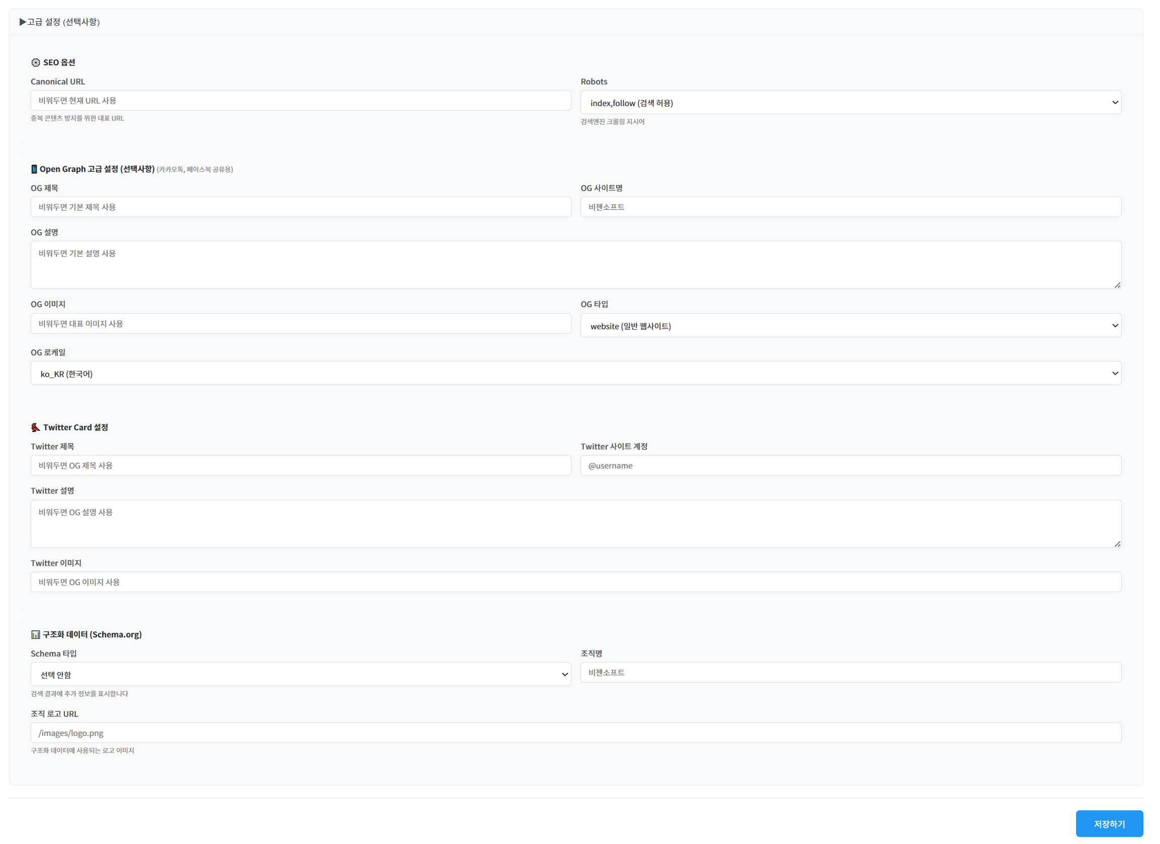 사이트 제목, 설명, 대표 이미지, 키워드 등 전체 사이트에 공통으로 적용될 기본값을 설정합니다. 이 한 번의 설정으로 모든 페이지에 기본 SEO가 적용됩니다.