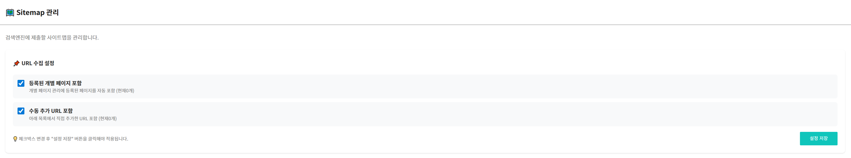 SEO 등록된 페이지들로 사이트맵을 자동 생성합니다. 별도 URL이 필요하면 수동으로 추가할 수도 있습니다.