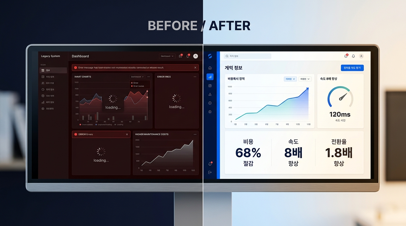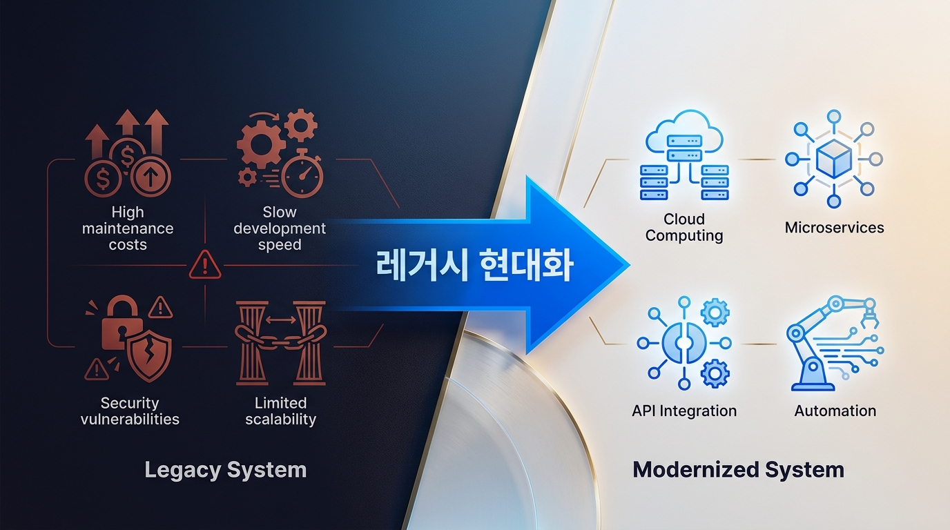 국내 제조업 중견기업 A사는 2003년에 도입한 ERP 시스템을 여전히 사용하고 있었습니다. 매달 유지보수 비용만 수천만 원이 나갔고, 신규 기능 하나 추가하려면 6개월씩 기다려야 했습니다. 담당 임원은 "이 시스템이 언제 멈춰도 이상하지 않다"고 했지만, 막상 현대화 프로젝트를 시작하려니 어디서 손대야 할지 막막했습니다. 결국 성급하게 전면 교체를 시도했다가 데이터 마이그레이션 도중 핵심 거래 데이터 일부가 유실되는 사고가 발생했고, 3개월간 업무 마비 사태를 겪었습니다.