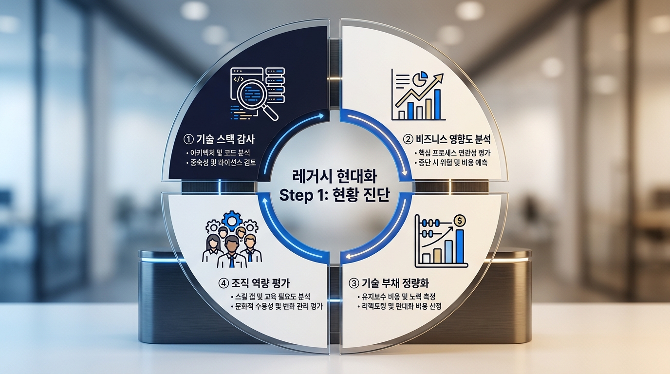 레거시 현대화 프로젝트가 실패하는 가장 흔한 이유 1위는 놀랍게도 충분한 현황 진단 없이 솔루션부터 선택하는 것입니다. "클라우드로 가야 한다고 하니까 AWS 도입하겠습니다"처럼 방향성만 정한 채 시작하면, 중간에 예상치 못한 의존성과 기술 부채(Technical Debt)가 쏟아져 나옵니다.
