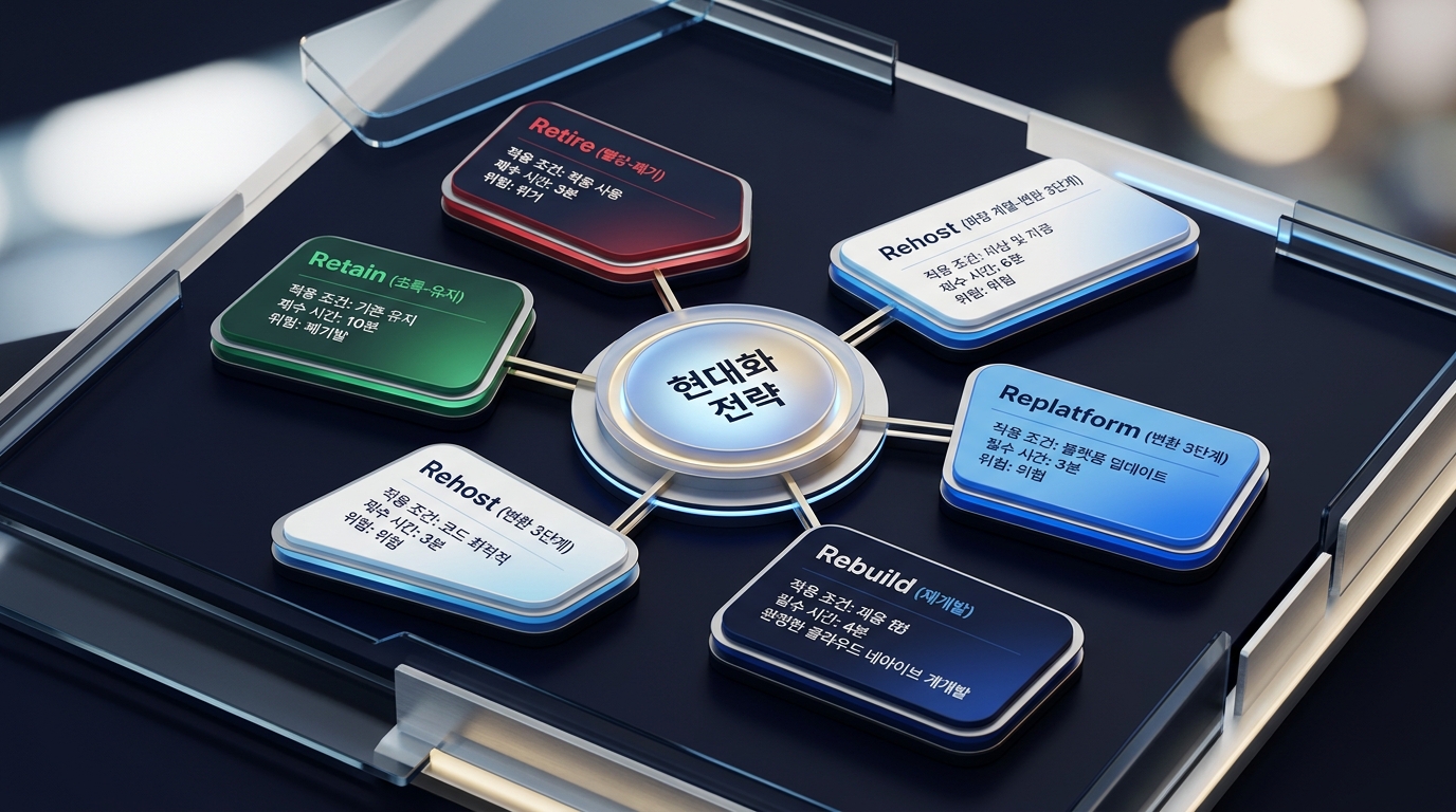 현황 진단이 끝났다면, 이제 어떤 방식으로 현대화할 것인지 전략을 선택할 차례입니다. 업계에서 가장 널리 사용되는 전략 프레임워크는 '6R 프레임워크' 입니다. 각각 Retire(폐기), Retain(유지), Rehost(재호스팅), Replatform(리플랫포밍), Refactor(리팩토링), Rebuild(재개발)의 6가지 전략을 가리킵니다.