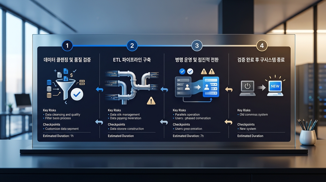 전략이 결정됐다면, 이제 가장 많은 기업이 가장 많이 실수하는 단계인 실행 단계입니다. 시스템 마이그레이션(System Migration)은 단순히 데이터를 복사하는 작업이 아닙니다. 데이터의 품질 검증, 비즈니스 로직의 이식, 사용자 수용성 확보까지 포함한 복합적 작업입니다.