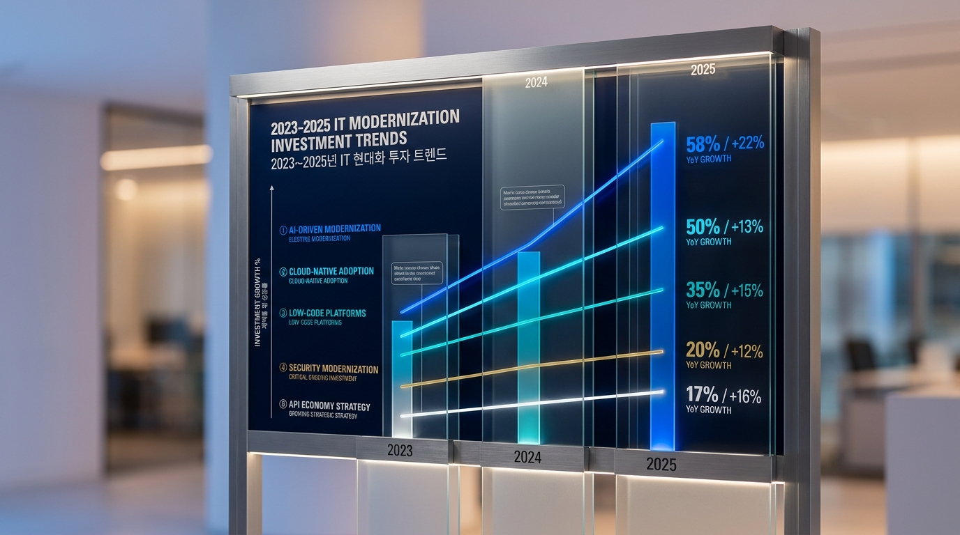 레거시 현대화는 단발성 프로젝트가 아닙니다. 기술 환경이 빠르게 진화하는 만큼, 현재 업계가 어느 방향으로 움직이고 있는지 파악하는 것이 장기 전략 수립의 핵심입니다. 2025년 현재, IT 현대화 분야를 주도하는 5가지 핵심 트렌드를 정리합니다.