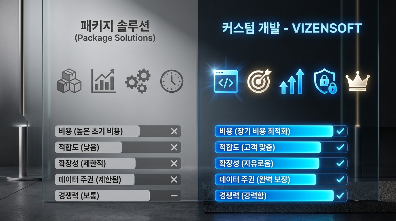 | 구분 | 패키지 솔루션 (SaaS/ERP 패키지) | 커스텀 개발 (비젠소프트) |