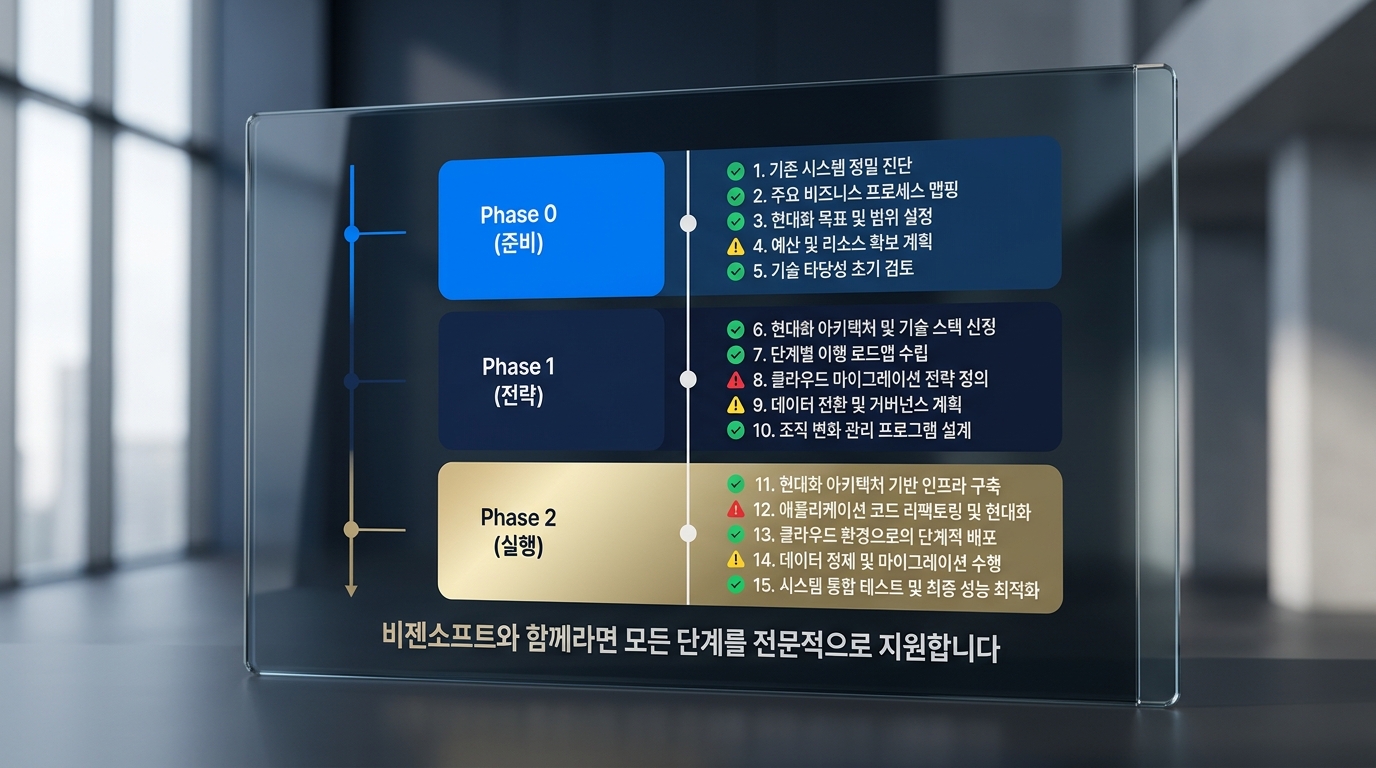 넷째, 조직 역량 평가 입니다. 현재 개발팀이 새로운 기술 스택을 습득할 수 있는 역량을 갖추고 있는지, 외부 파트너에 얼마나 의존해야 하는지를 파악합니다. 기술이 아무리 훌륭해도 운영할 인력이 없으면 현대화 후 시스템은 또 다른 레거시가 됩니다. 비젠소프트는 초기 현황 진단 단계부터 고객사의 IT 환경을 면밀히 분석하여 최적의 현대화 경로를 제안합니다.