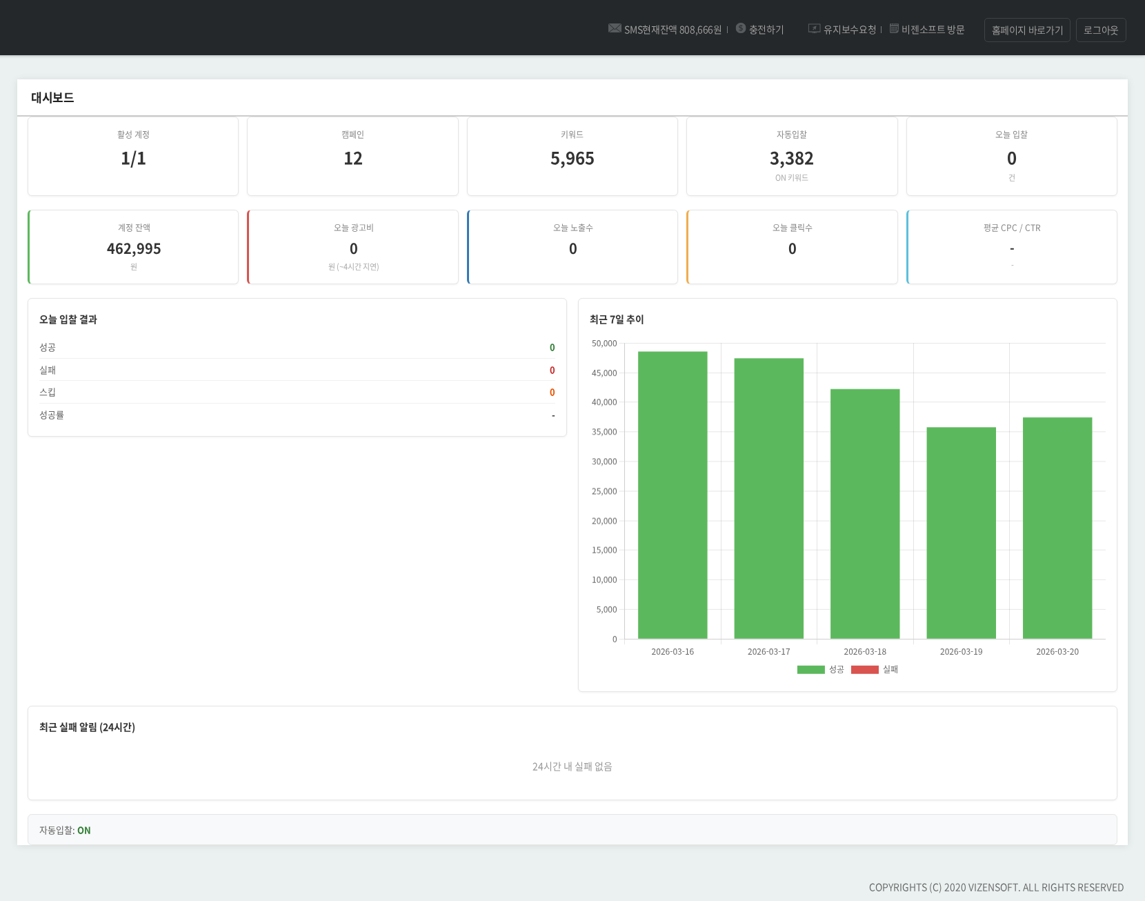 ▲ 대시보드 화면 — 활성 계정, 캠페인/키워드 수, 오늘 입찰 현황(성공/실패/건너뜀), 계정 잔액, 노출/클릭/광고비 실적이 한 화면에 표시됩니다