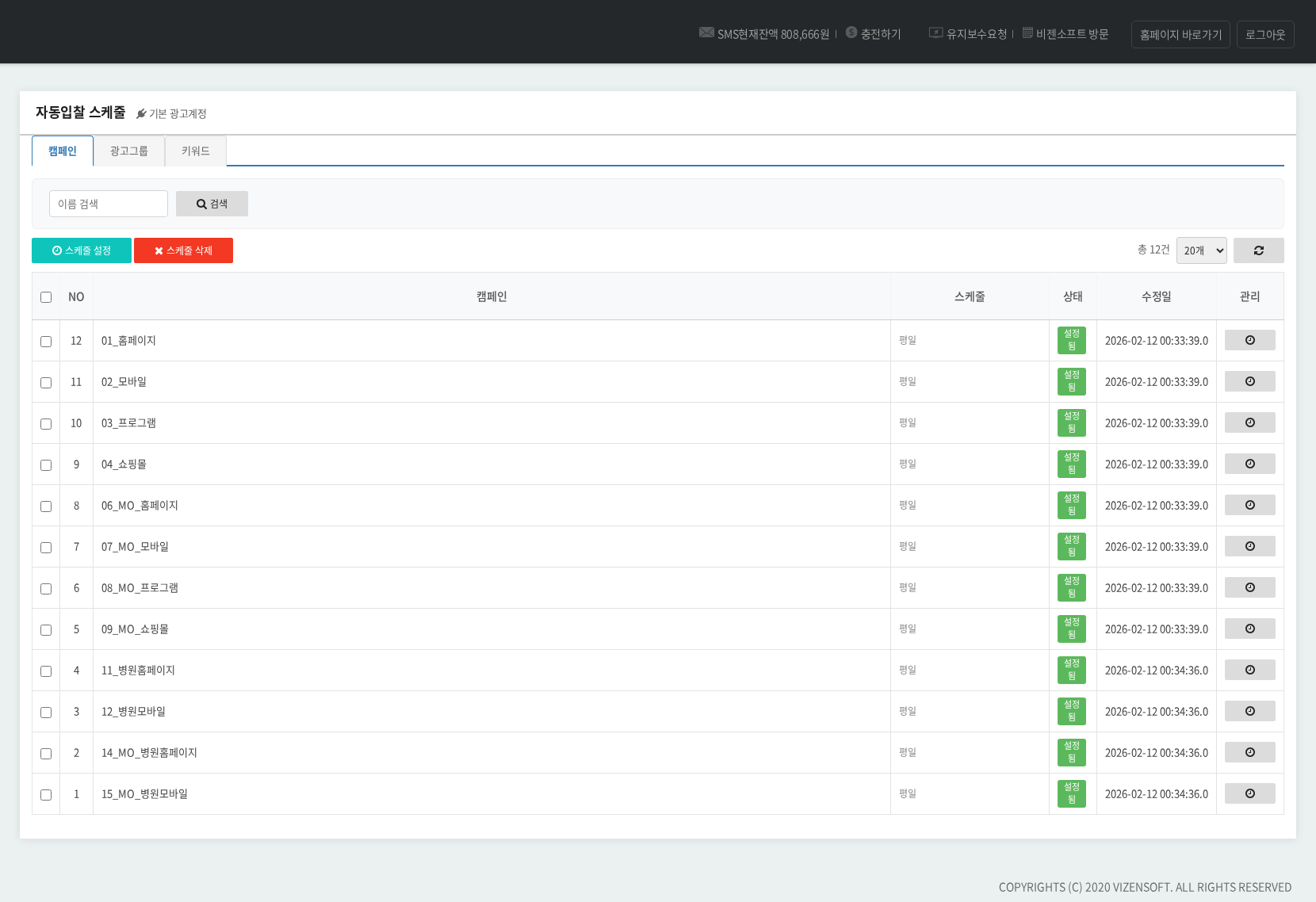 ▲ 스케줄 관리 화면 — 캠페인/광고그룹/키워드별로 요일×시간대 입찰 스케줄을 JSON 형식으로 세밀하게 설정합니다