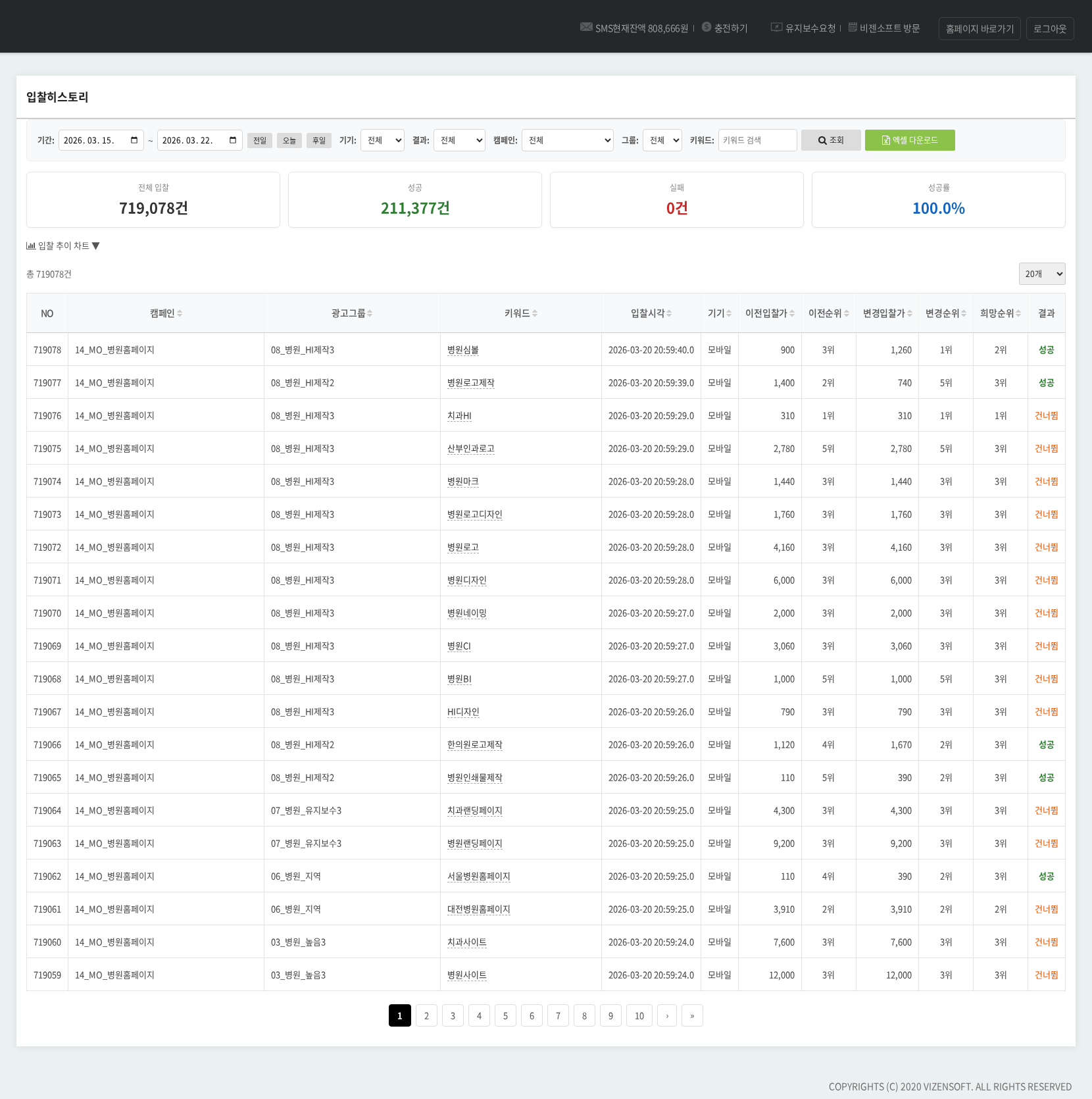 ▲ 입찰 이력 화면 — 키워드별로 입찰 시각, 이전/신규 입찰가·순위, 결과 상태(성공/실패/건너뜀)를 상세하게 조회하고 엑셀로 다운로드합니다