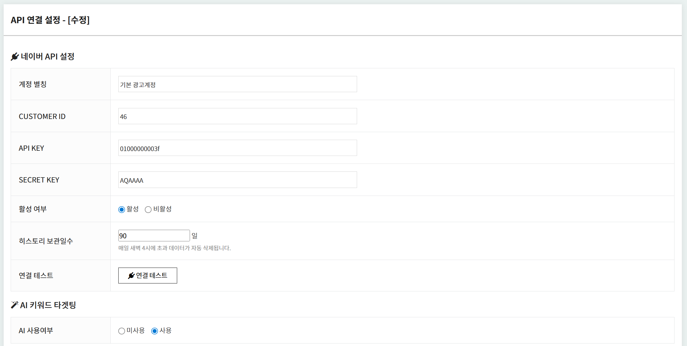 ▲ API 설정 화면 — 다중 네이버 광고 계정을 등록하고, 계정별 API 키·비밀키(AES256 암호화)·AI 설정·히스토리 보관기간을 관리합니다