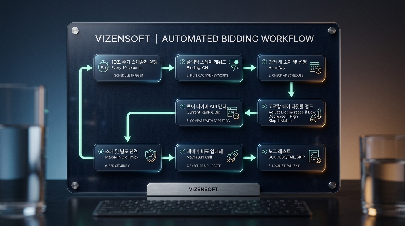 비젠소프트의 자동입찰 스케줄러는 10초마다 자동으로 실행됩니다. 자동입찰이 켜진 키워드를 스캔하고, 현재 순위가 희망 순위와 다르면 즉시 입찰가를 조정합니다.