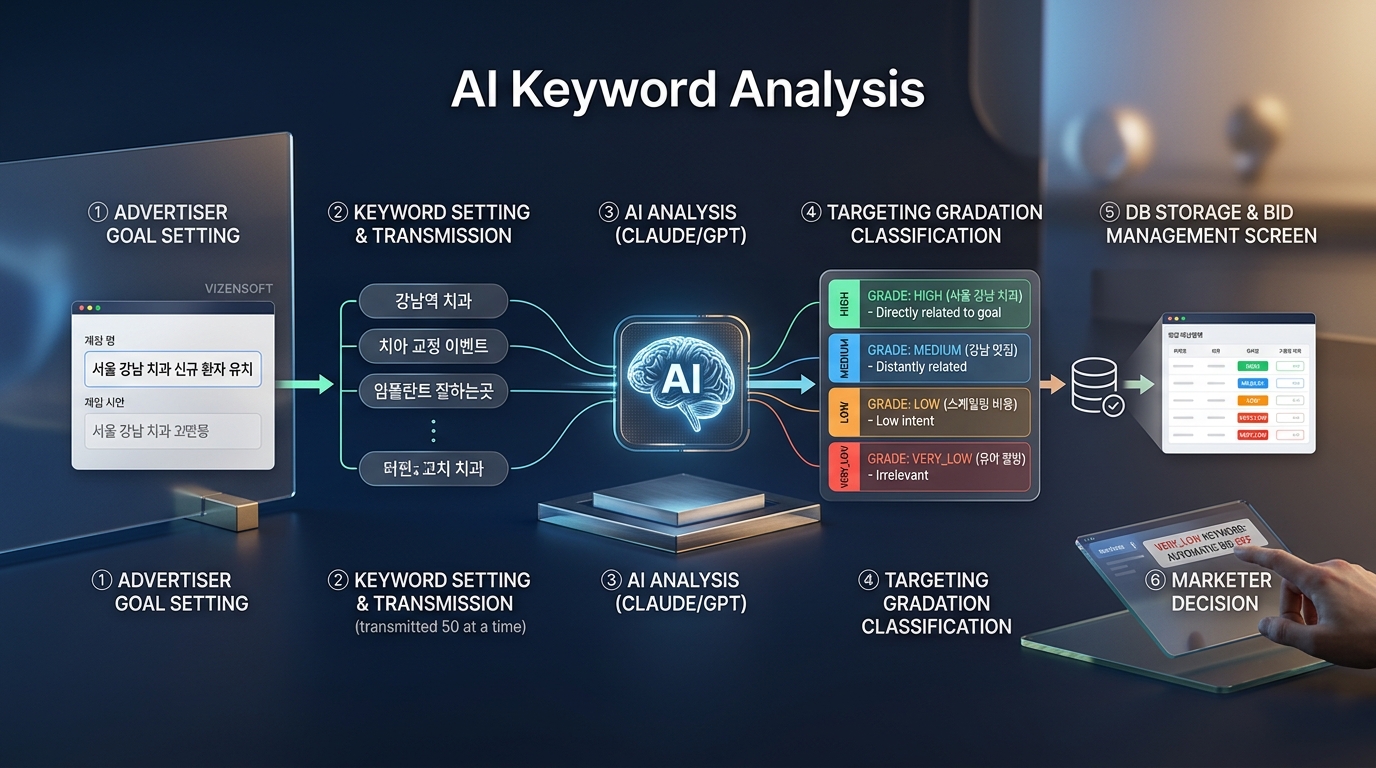관리자가 "광고 목표"(예: "서울 강남 지역 신규 치과 환자 유치")를 설정하면, AI가 각 키워드를 분석하여 4단계 타겟팅 등급으로 분류합니다: