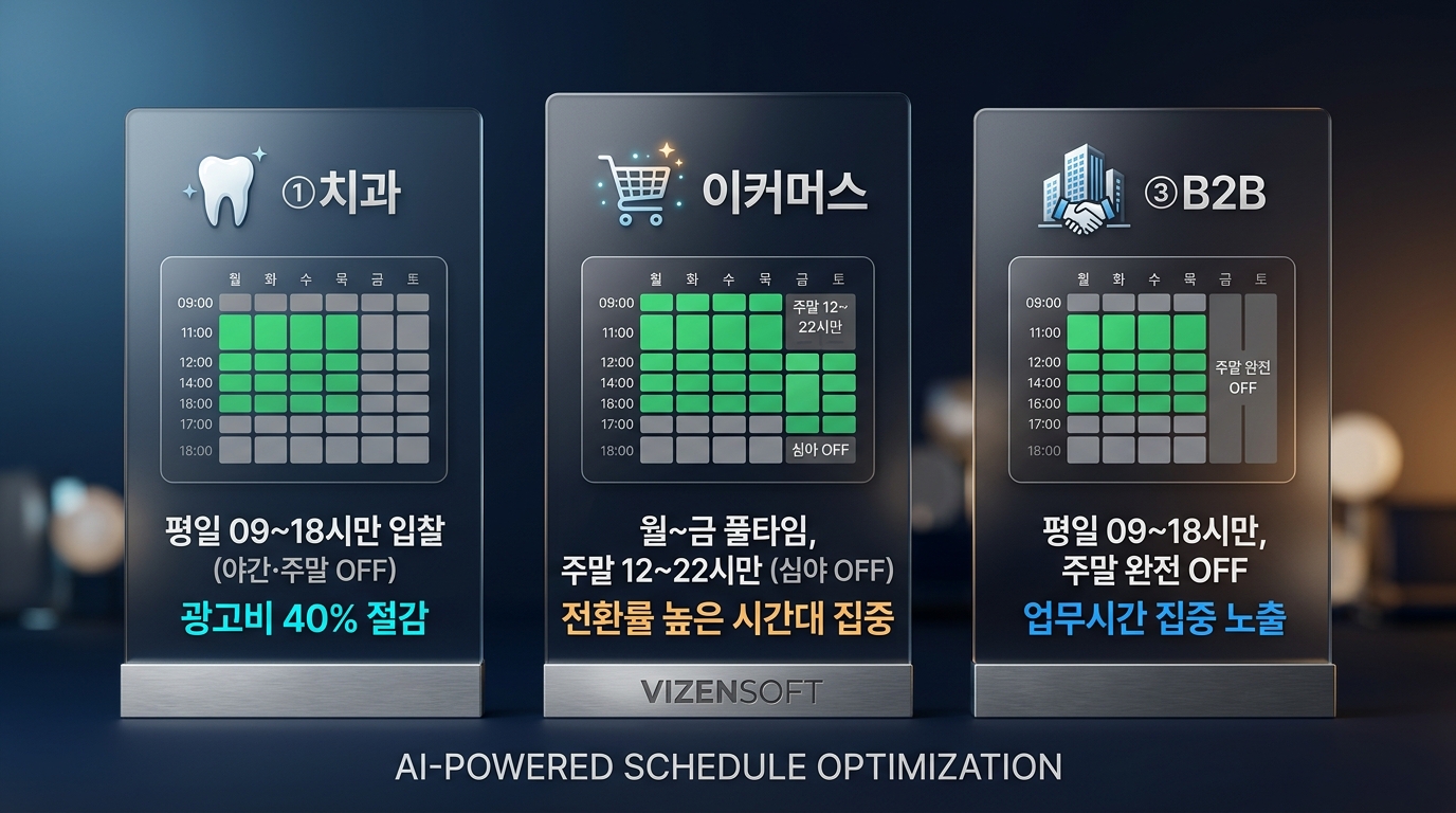 치과라면 새벽 3시에 광고를 노출할 이유가 없고, B2B 기업이라면 주말에 광고비를 쓸 필요가 없습니다. 하지만 자동입찰이 24시간 돌아가면 의미 없는 시간대에도 입찰가를 높이는 낭비가 발생할 수 있습니다.