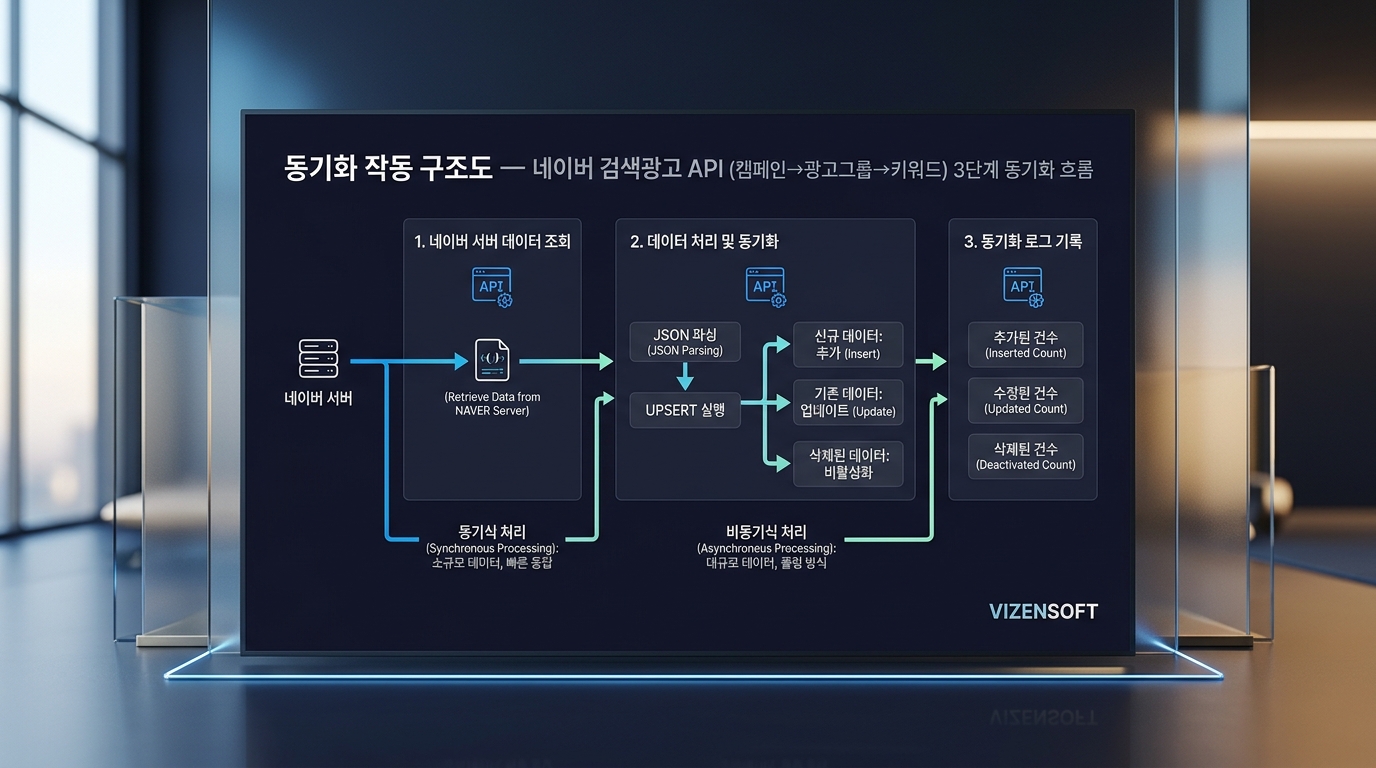비젠소프트의 동기화 시스템은 캠페인 → 광고그룹 → 키워드 3단계로 네이버 검색광고 데이터를 가져옵니다.