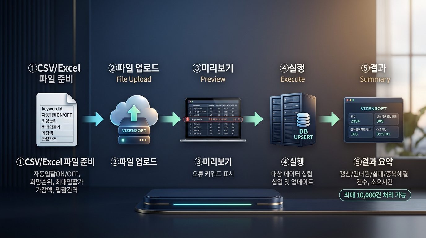 광고 계정에 키워드가 수백~수천 개인 경우, 각 키워드의 희망순위·최대입찰가·가감액을 하나씩 설정하려면 며칠이 걸립니다. 대행사라면 다수 광고주의 키워드를 동시에 관리해야 하므로 이 문제는 더욱 심각합니다.