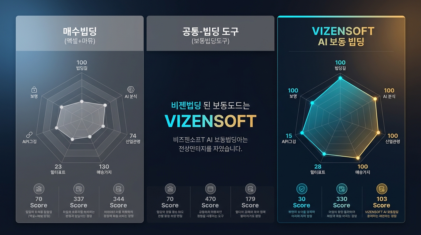 비교 항목 | 수동 입찰 | 일반 자동입찰 도구 | 비젠소프트 AI 자동입찰 |