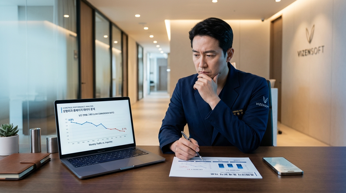 강남에서 성형외과를 운영하는 A 원장님의 사례를 들어볼게요. 개원 초기, 지인 소개로 웹에이전시에 의뢰해 홈페이지를 제작했습니다. 디자인은 깔끔했고, 시술 소개 페이지도 잘 정리돼 있었죠. 하지만 6개월이 지나도록 홈페이지를 통한 신규 환자 유입은 월 3~5명 수준에 그쳤습니다. 문제는 디자인이 아니었습니다. 검색에서 보이지 않고, 방문한 사람이 상담 신청까지 이어지는 구조가 없었던 것이 핵심이었습니다.