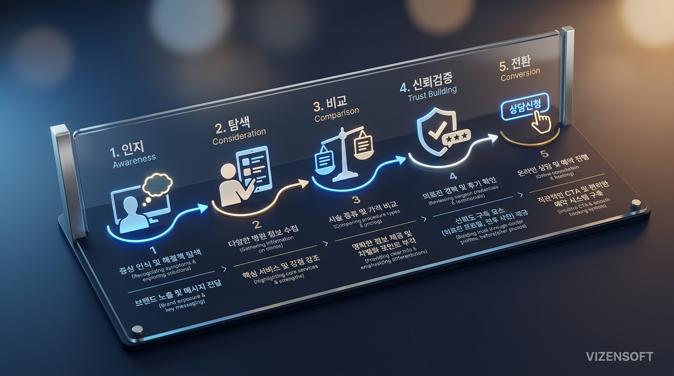 성형외과 홈페이지 제작은 일반 기업 웹사이트나 쇼핑몰 제작과는 본질적으로 다른 전략이 필요합니다. 그 이유를 이해하려면 먼저 성형 소비자의 구매 여정(Customer Journey)을 이해해야 합니다.