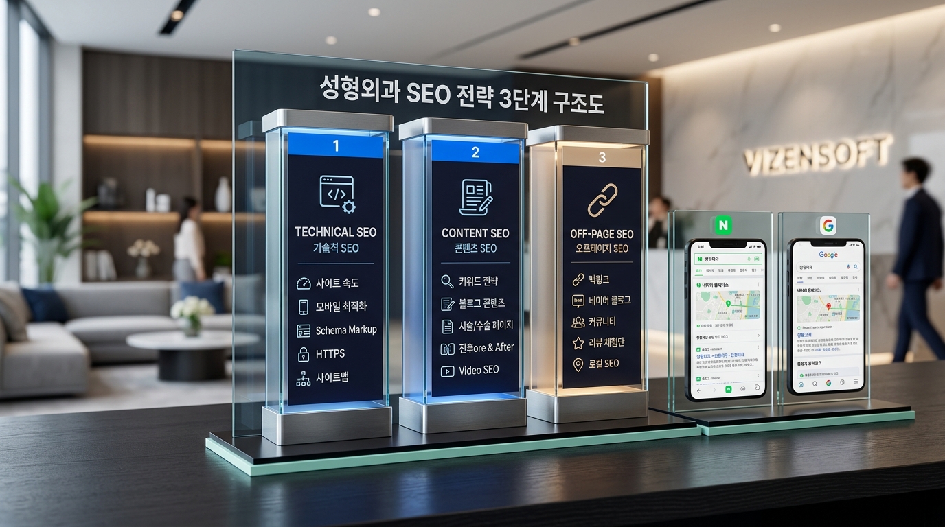 효과적인 성형외과 SEO 전략은 다음 세 가지 축으로 구성됩니다. ①기술적 SEO: 페이지 로딩 속도 3초 이내, 모바일 반응형 설계, 구조화된 데이터 마크업(Schema.org - LocalBusiness, Physician), 메타 태그 최적화. ②콘텐츠 SEO: 시술별 상세 랜딩 페이지 구성, FAQ 섹션, 의사 칼럼, 시술 후기 콘텐츠 등 롱테일 키워드 공략. ③오프페이지 SEO: 네이버 지식iN 활동, 블로그 연동, 외부 링크 빌딩.