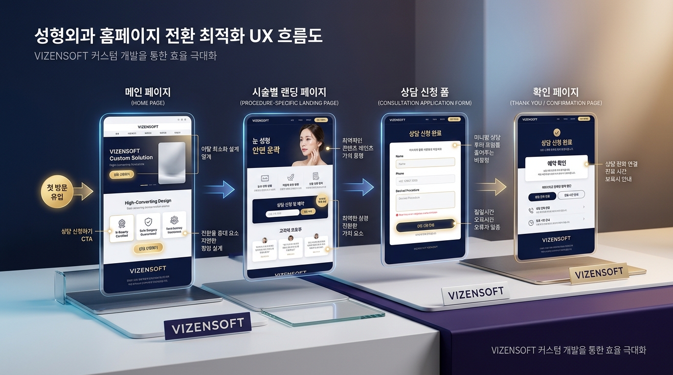 성형외과 홈페이지가 갖춰야 하는 고유한 요소들은 다음과 같습니다. 첫째, 의료법 준수 구조 — 의료광고 심의 기준에 맞는 콘텐츠 설계가 필수입니다. 허위·과장 광고로 분류될 수 있는 표현을 피하면서도 충분한 설득력을 갖춰야 합니다. 둘째, 신뢰 형성 요소 — 의사 프로필, 학력/경력, 학회 인증, 수술 건수, 언론 보도 등 신뢰 지표를 적극적으로 시각화해야 합니다. 셋째, 전환 최적화 UX — 상담 신청 버튼의 위치, 색상, 문구, 클릭 후 랜딩 페이지 흐름이 모두 전략적으로 설계돼야 합니다.