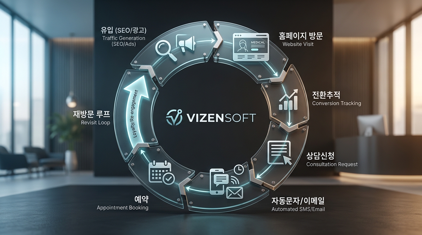 더 나아가 마케팅 자동화 시스템을 홈페이지와 연동하면, 상담 신청 후 자동 문자 발송, 미상담 잠재 고객 리타겟팅, 이메일 드립 캠페인 등을 자동화할 수 있습니다. 예를 들어, 홈페이지에서 상담 신청을 완료한 환자에게는 즉시 확인 문자와 함께 원장 소개 콘텐츠 링크를 자동 발송하고, 3일 뒤에도 예약이 없으면 "아직 고민 중이신가요? 무료 카운셀링을 제공해드립니다"라는 메시지를 자동으로 보내는 식입니다. 이런 자동화 퍼널 하나가 이탈 잠재 고객의 15~20%를 재전환시키는 효과를 냅니다.