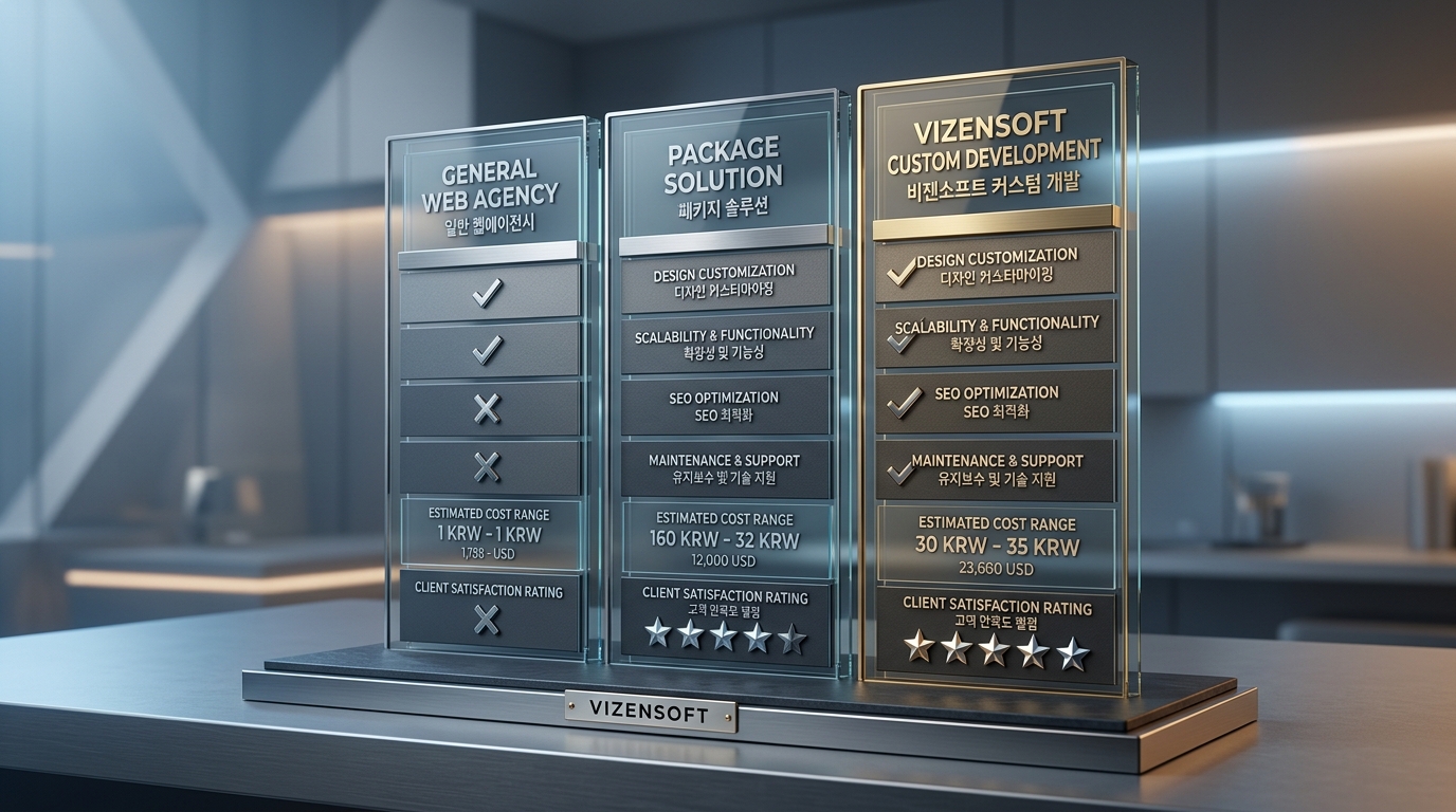 비젠소프트의 커스텀 개발은 초기 투자 비용이 더 들어가지만, SEO 최적화, 전환 추적, AI 챗봇, 마케팅 자동화, 광고 자동입찰 시스템까지 통합된 디지털 마케팅 인프라를 한 번에 구축할 수 있다는 점에서 장기적인 관점에서 훨씬 높은 ROI를 제공합니다. "홈페이지 제작"이 아닌 "매출 성장 시스템 구축"으로 접근하는 것이 비젠소프트의 핵심 가치입니다.