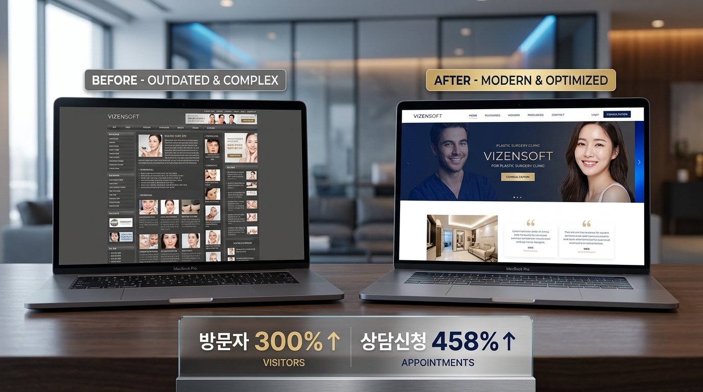 [사례: 서울 강남구 B성형외과] - 리뉴얼 이전 상황: 월 홈페이지 방문자 약 1,200명, 상담 신청 월 12건, 실제 예약 전환 월 4건. 네이버 광고비 월 400만 원 소진 중. - 주요 문제 진단: ① 홈페이지 로딩 속도 7.2초 (업계 평균의 2배 이상), ② 시술 안내가 단일 페이지에 모두 집약되어 SEO 키워드 분산 불가, ③ 모바일 상담 신청 버튼이 스크롤해야만 보이는 구조, ④ 전환 추적 없이 광고비 집행. - 솔루션 적용: 전략적 커스텀 홈페이지 재구축 (시술별 랜딩 페이지 32개 신규 생성), SEO 기술 최적화 (로딩 속도 1.8초로 단축), 전환 추적 시스템 연동, AI 챗봇 도입, 네이버 광고 자동입찰 시스템 적용. - 6개월 후 결과: 월 방문자 4,800명 (300% 증가), 상담 신청 월 67건 (458% 증가), 실제 예약 전환 월 23건 (475% 증가), 광고비는 동일 400만 원 유지에서 광고 효율 31% 개선. - 12개월 후 매출: 홈페이지 리뉴얼 전 대비 월 매출 2.3배 성장.