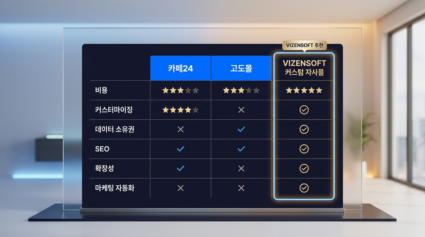 이제 실제로 선택할 수 있는 옵션들을 직접 비교해보겠습니다. 카페24, 고도몰, 그리고 비젠소프트 커스텀 자사몰을 주요 기준으로 비교합니다.