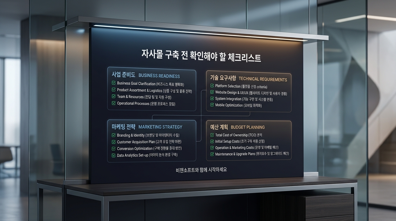 자사몰 구축을 결정했다면, 무작정 개발에 들어가기보다 체계적인 준비와 전략 수립이 먼저입니다. 아래 체크리스트를 통해 현재 준비 상태를 점검해보세요.