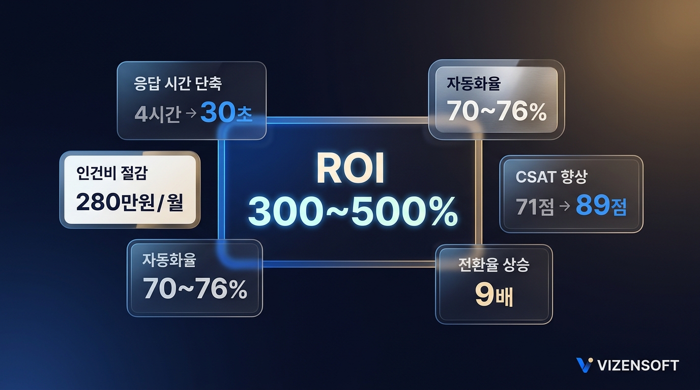 비용 절감 측면에서는 상담 인건비 절감이 가장 직접적입니다. 상담사 1인 인건비가 월 350만 원이라고 할 때, 챗봇이 전체 문의의 70%를 처리하면 이론적으로 약 2인분 이상의 인건비를 절감할 수 있습니다. 단기 계약직 또는 야간 추가 근무 비용 절감 효과까지 합치면 연간 절감액이 상당합니다.
