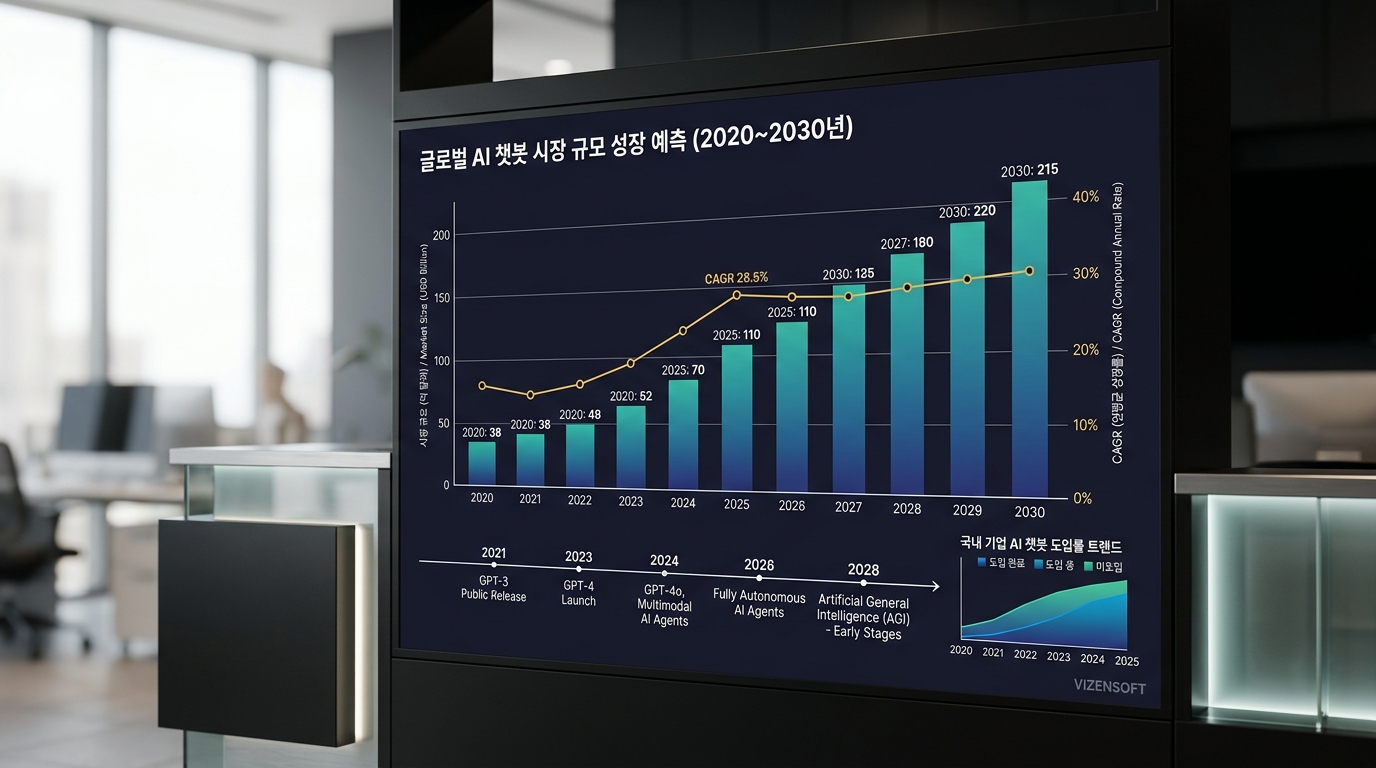 AI 챗봇 시장은 폭발적으로 성장하고 있습니다. Grand View Research에 따르면, 글로벌 챗봇 시장 규모는 2023년 약 58억 달러에서 2030년 420억 달러로 성장할 것으로 예측됩니다. 연평균 성장률(CAGR) 약 23.3%로, IT 산업 전체 평균의 4배 이상입니다.