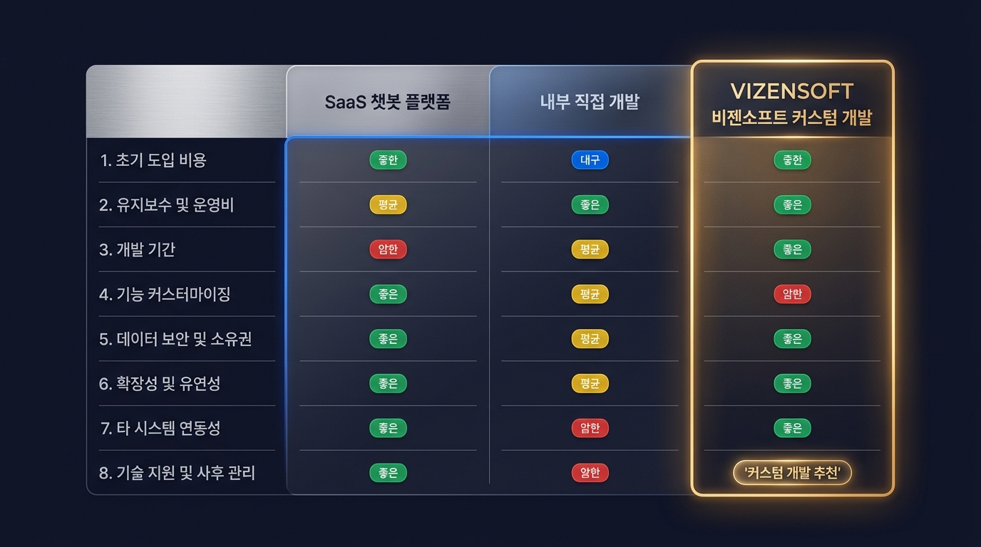 | 비교 항목 | SaaS 챗봇 플랫폼 | 내부 직접 개발 | 비젠소프트 커스텀 개발 |