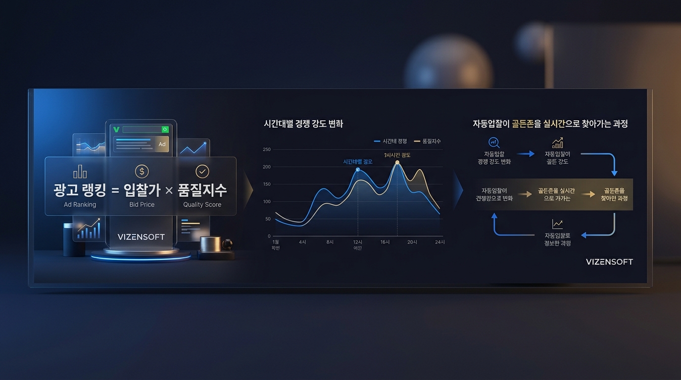 특히 주목해야 할 개념이 "입찰가 적정선의 골든존(Golden Zone)"입니다. 이는 최소한의 CPC로 목표 노출 순위를 달성할 수 있는 입찰가 범위를 의미합니다. 이 골든존은 시간대별, 요일별, 계절별로 지속적으로 변동하기 때문에 수동으로는 사실상 추적이 불가능하며, 이를 정확히 포착하는 것이 바로 자동입찰 시스템의 핵심 가치입니다.