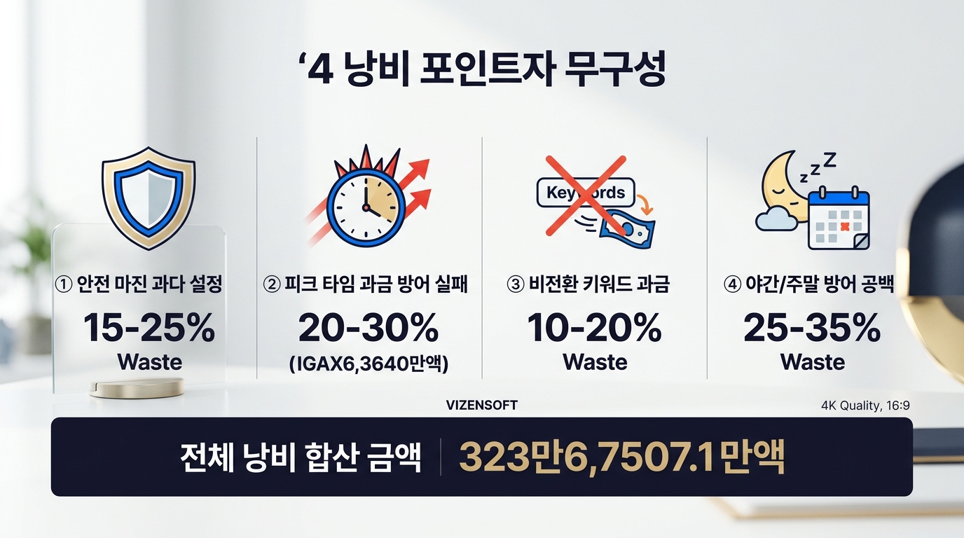 네 번째 낭비 포인트: 야간/주말 방어 공백입니다. 경쟁사들 중 일부는 자동화 시스템을 활용해 야간이나 주말에도 적극적인 입찰 전략을 구사합니다. 수동으로만 관리하는 광고주는 이 시간대에 경쟁에서 일방적으로 밀리거나, 반대로 경쟁이 줄어든 야간에 불필요하게 높은 입찰가를 유지하여 비용 효율이 낮아지는 이중 손실을 겪게 됩니다.