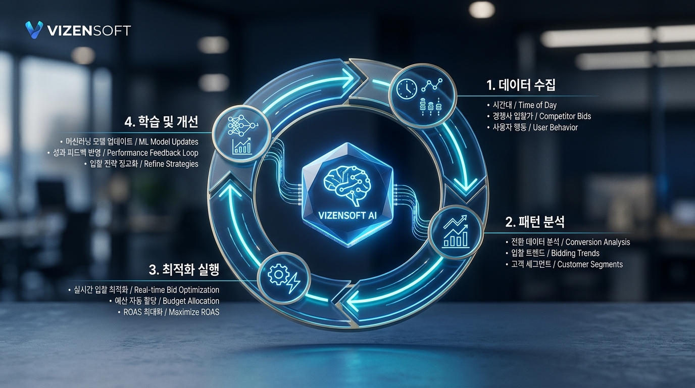 구체적인 작동 과정을 단계별로 살펴보면 다음과 같습니다. 1단계(데이터 수집): 키워드별 시간대별 성과 데이터, 경쟁 입찰가 범위, 품질지수 변화를 지속적으로 수집합니다. 2단계(패턴 분석): 수집된 데이터에서 전환율이 높은 시간대, CPC 효율이 좋은 입찰가 범위, 경쟁이 약한 틈새 시간 등을 분석합니다. 3단계(최적화 실행): 분석 결과를 바탕으로 15분~1시간 단위로 키워드별 입찰가를 자동 조정합니다. 4단계(학습 및 개선): 입찰가 조정 후의 성과를 피드백으로 받아 모델을 지속적으로 개선합니다.