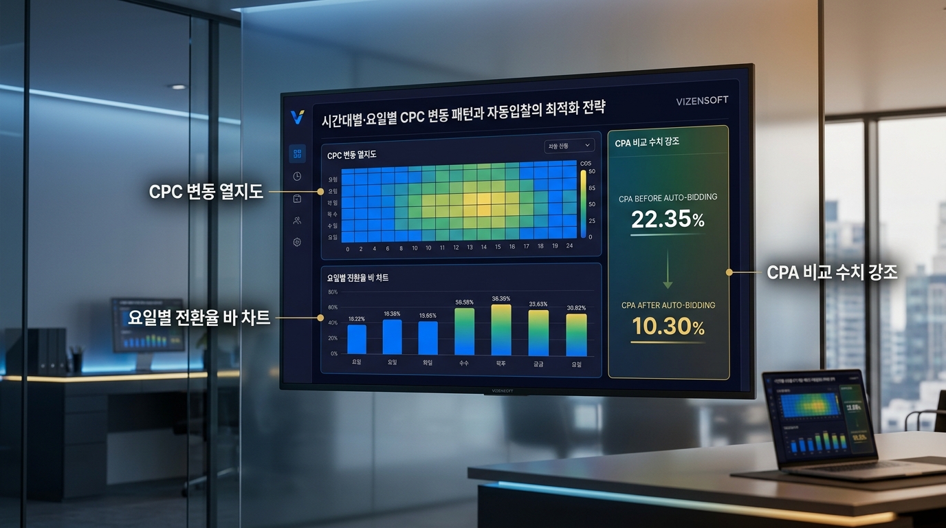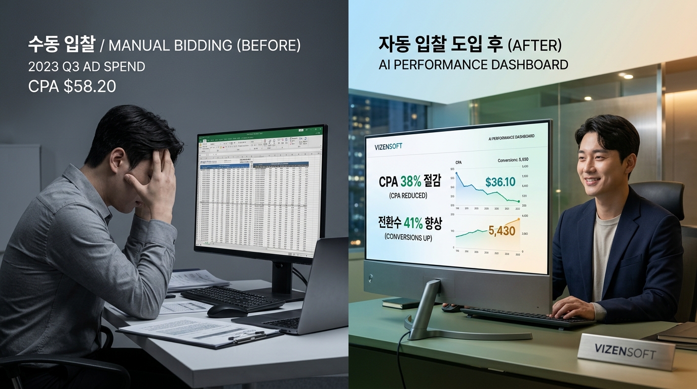 D사는 월 광고비 400만 원으로 어학·자격증 관련 키워드 120개를 운영하고 있었습니다. 수동 입찰 관리를 5년간 해왔지만, 경쟁이 심화되면서 CPC는 지속 상승하고 전환율은 하락하는 악순환이 지속되었습니다. 비젠소프트의 AI 자동입찰 시스템을 도입한 지 2개월 후, 평균 CPC가 기존 대비 22% 하락했고, 같은 예산으로 획득한 전환수(수강 신청)는 41% 증가했습니다. 특히 저녁 7시~10시 구간의 집중 최적화 전략이 전환수 증가의 핵심 요인이었습니다.
