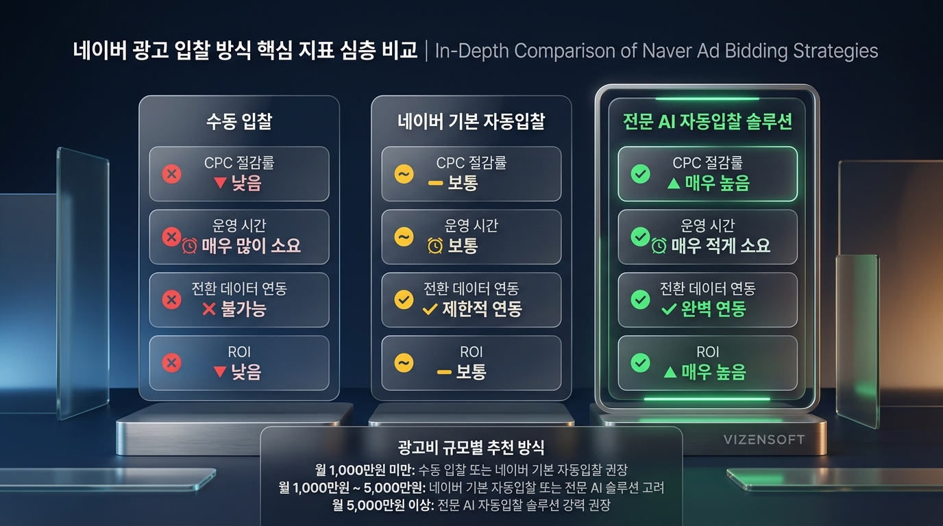 | 구분 | 수동 입찰 관리 | 네이버 기본 자동입찰 | 전문 AI 자동입찰 솔루션 (비젠소프트) |