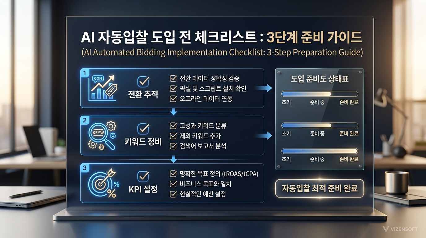 자동입찰 시스템을 도입한다고 해서 무조건 효과가 보장되는 것은 아닙니다. 올바른 환경과 사전 준비가 갖춰졌을 때 자동입찰의 효과가 극대화됩니다. 도입 전 반드시 확인해야 할 핵심 체크리스트를 단계별로 정리했습니다.