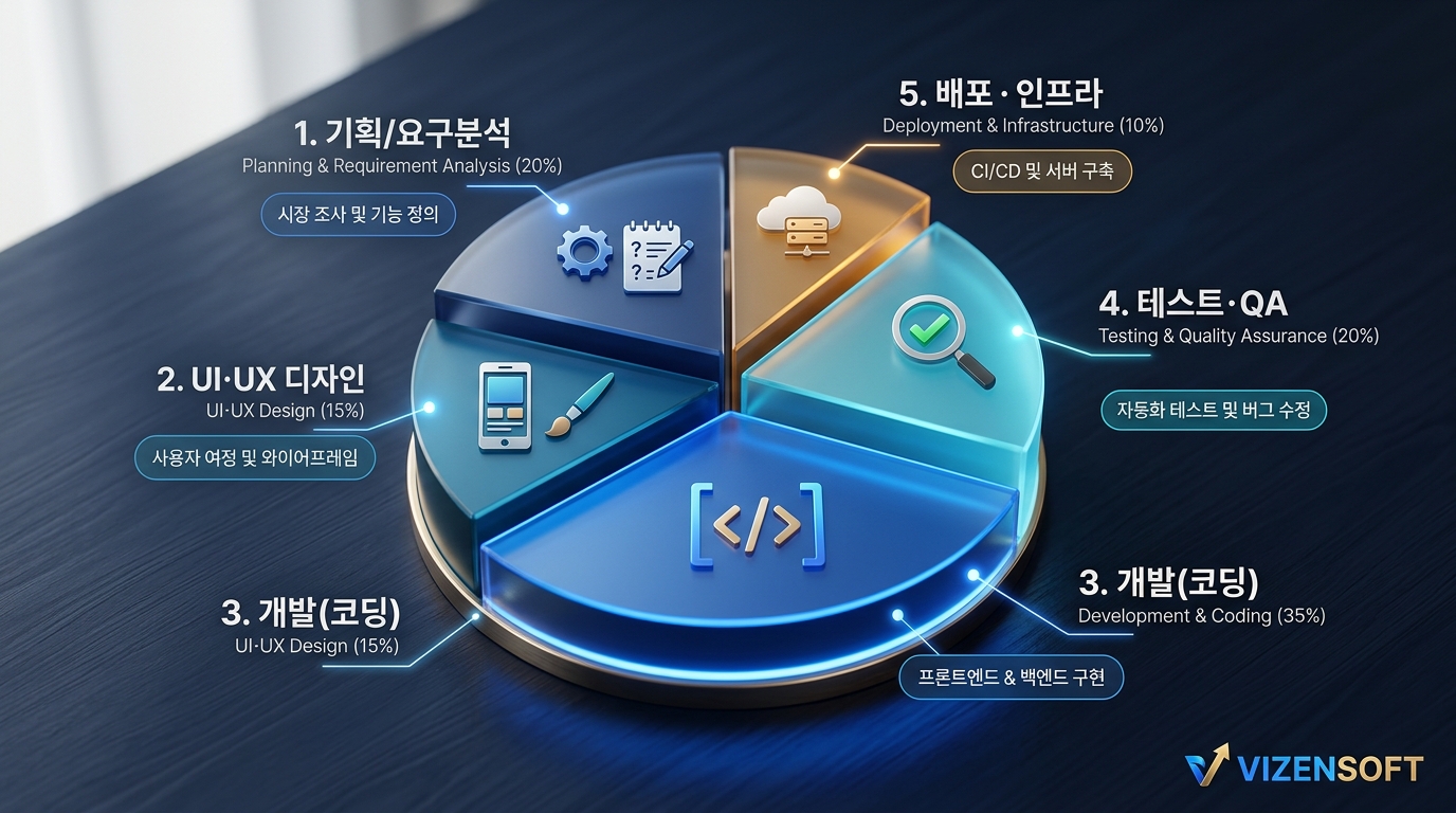 소프트웨어 개발 비용은 크게 다섯 가지 구성 요소로 분류됩니다. 첫째는 기획 및 요구사항 분석 비용입니다. 프로젝트가 시작되기 전에 무엇을 어떻게 만들지를 정의하는 작업으로, 전체 프로젝트 비용의 10~20%를 차지하며 이 단계가 허술하면 나중에 수십 배의 재작업 비용이 발생합니다. 둘째는 UI/UX 디자인 비용으로, 사용자가 실제로 마주하는 화면을 설계하고 디자인하는 작업입니다. 셋째는 개발(코딩) 비용으로, 대부분의 의뢰인이 떠올리는 바로 그 작업입니다. 프론트엔드(화면), 백엔드(서버), 데이터베이스 설계 등이 포함됩니다. 넷째는 테스트 및 QA 비용으로, 만들어진 프로그램이 정상적으로 작동하는지 오류 없이 검증하는 과정입니다. 다섯째는 배포 및 인프라 구축 비용으로, 서버 설정, 도메인 연결, 보안 설정 등 실제 서비스 운영에 필요한 환경을 구성하는 비용입니다.