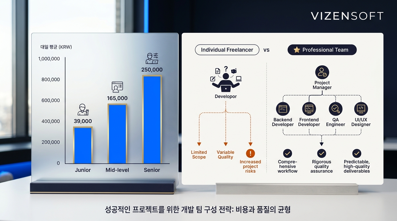 더 중요한 것은 개발 팀의 구성입니다. 프리랜서 1인이 모든 것을 담당하는 경우와, PM(프로젝트 매니저), 기획자, UX 디자이너, 프론트엔드 개발자, 백엔드 개발자, QA 엔지니어가 팀을 이루어 역할 분담을 하는 경우는 결과물의 완성도와 안정성에서 하늘과 땅 차이가 납니다. 당연히 팀 기반의 프로젝트는 비용이 더 높을 수밖에 없습니다.
