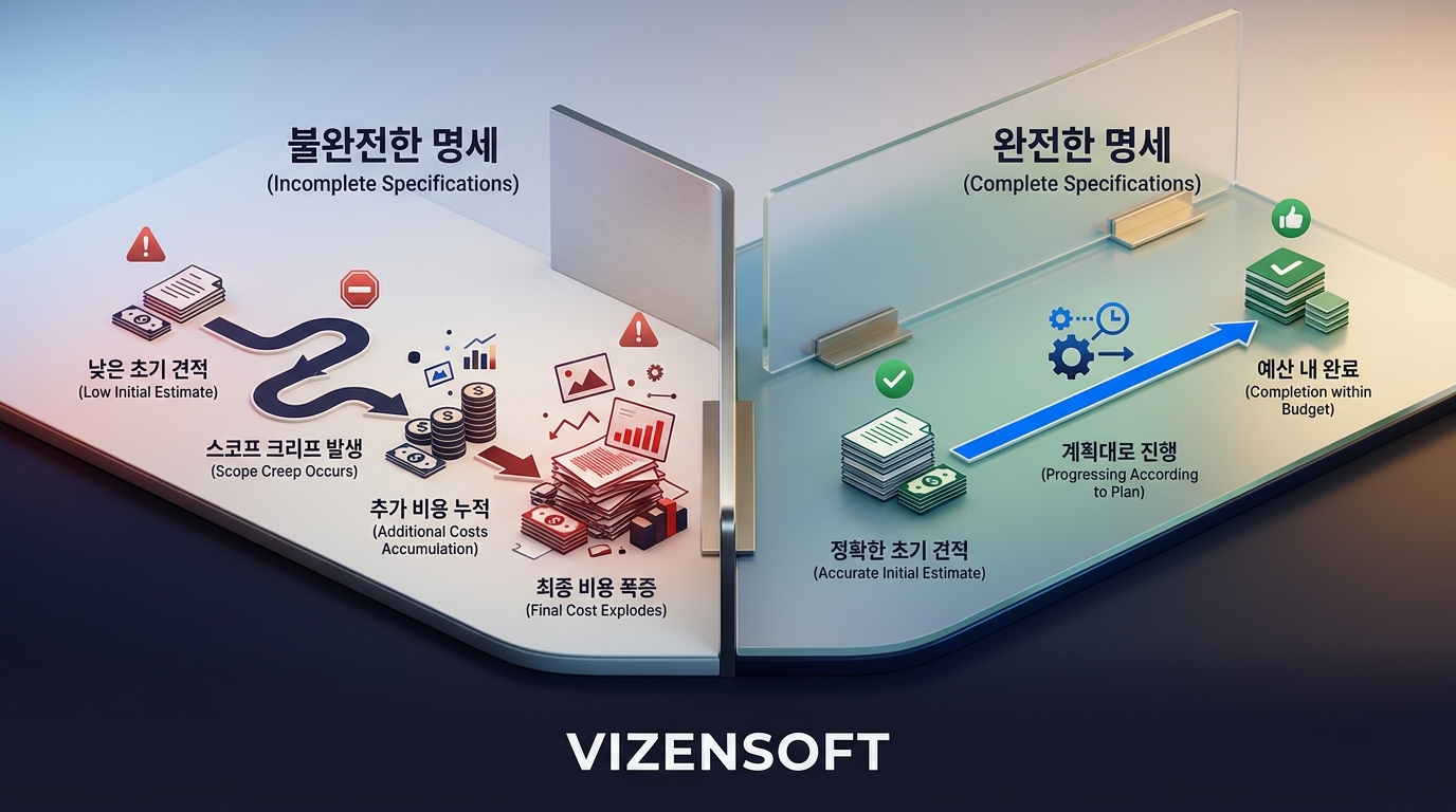 요구사항 명세의 완성도에 따른 견적의 차이는 단순히 '범위가 다르기 때문'만은 아닙니다. 명세가 불완전할수록 개발 도중 '이건 포함인가요, 제외인가요?'라는 분쟁이 발생합니다. 이를 업계에서는 '스코프 크리프(Scope Creep, 범위 확장)'라고 부릅니다. 초기 계약 범위 밖의 요구사항이 개발 중간에 추가되면, 업체는 추가 비용을 청구하게 되고 이것이 쌓이면 최종 비용이 처음 견적의 2~3배가 되는 경우도 허다합니다.