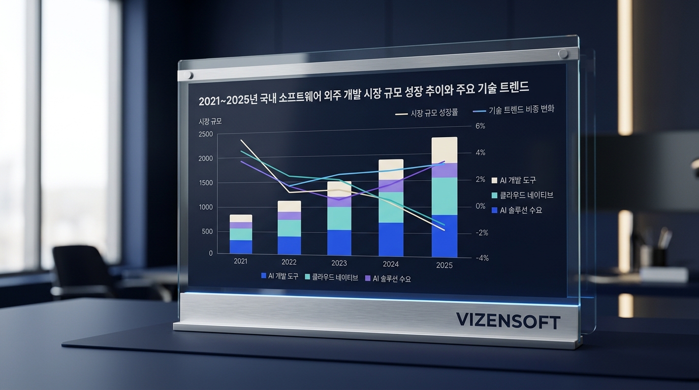 2024~2025년 국내 프로그램 개발 외주 시장은 급격한 변화를 맞이하고 있습니다. 코로나19 이후 디지털 전환이 가속화되면서 소프트웨어 개발 수요는 폭발적으로 증가했고, 이에 따라 개발 인력 부족과 단가 상승이 동시에 일어나고 있습니다. 과학기술정보통신부의 2023년 SW산업 실태조사에 따르면, 국내 소프트웨어 개발 시장 규모는 약 12조원을 상회하며 매년 8~10%씩 성장하고 있습니다.