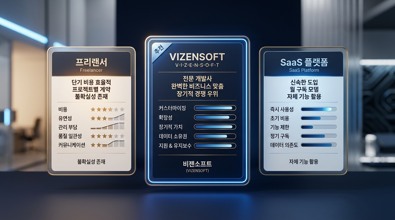 | 구분 | 프리랜서 (개인) | SaaS 플랫폼 커스터마이징 | 전문 커스텀 개발사 (비젠소프트 등) |