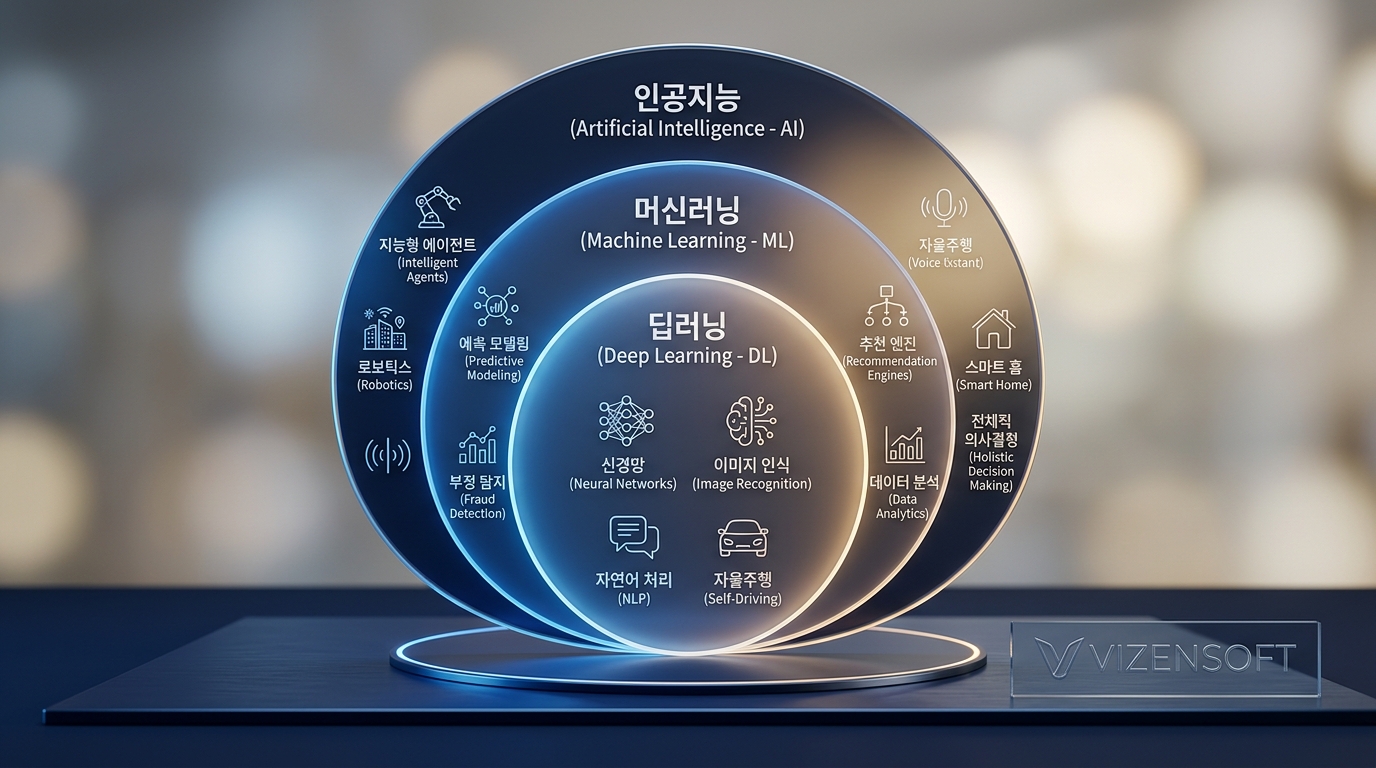 이 세 가지의 관계를 먼저 명확히 해야 합니다. 딥러닝은 머신러닝의 하위 집합입니다. 즉, 딥러닝은 머신러닝의 한 종류이지, 전혀 다른 기술 체계가 아닙니다. 하지만 실무에서는 이 두 개념을 구분해서 사용하는 것이 매우 중요합니다.