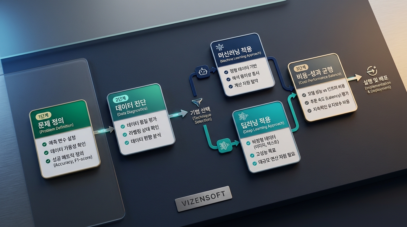 이 3단계 프레임워크만 제대로 적용해도 AI 프로젝트 성공률이 극적으로 높아집니다. 비젠소프트가 AI 모델 개발 프로젝트를 진행할 때도 항상 이 과정부터 시작합니다.