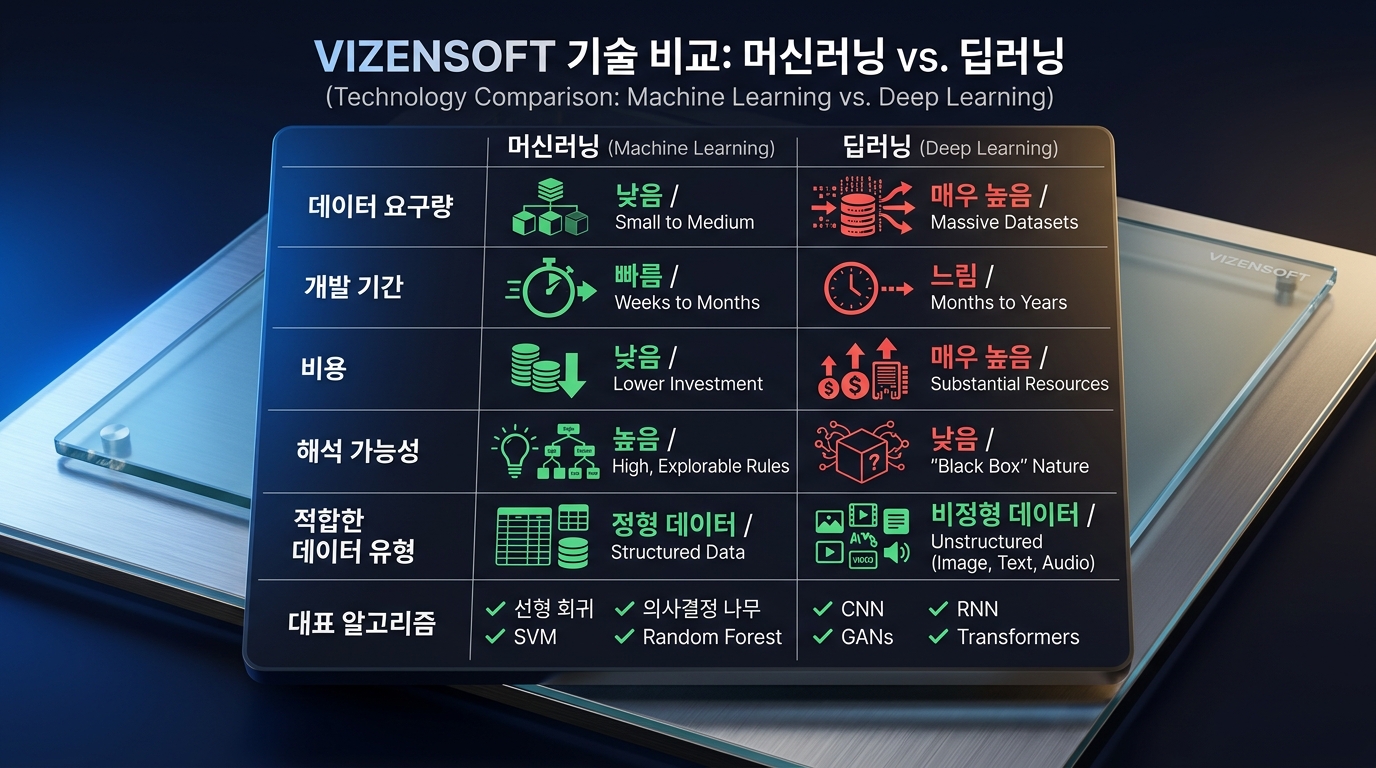 머신러닝은 정형 데이터, 빠른 개발, 설명 가능한 결과가 필요한 대부분의 비즈니스 예측·분류 문제에 최적입니다. 딥러닝은 대용량 비정형 데이터(이미지, 텍스트, 음성)를 다루거나 인간 수준의 인식 성능이 요구될 때 선택해야 합니다. 그리고 처음 AI를 도입하는 기업이라면 복잡한 딥러닝부터 시작하기보다는 머신러닝으로 빠르게 성과를 증명하고 점진적으로 고도화하는 전략이 가장 현실적입니다.