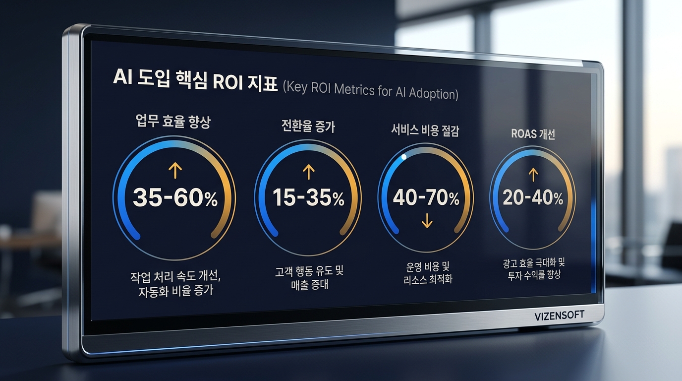 비용 절감 측면: AI 챗봇 도입으로 고객 서비스 비용 평균 40~70% 절감, AI 광고 자동입찰로 광고비 대비 성과(ROAS) 평균 20~40% 개선.
