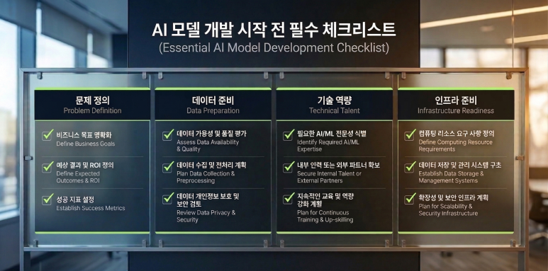 [기술 및 팀 역량 체크리스트] - ✅ 내부 AI 개발 역량이 있는가, 아니면 외부 전문 파트너가 필요한가? - ✅ 개발 후 모델 유지보수(MLOps) 담당자가 지정되었는가? - ✅ 모델 배포를 위한 IT 인프라(서버, API 연동 등)가 준비되었는가?