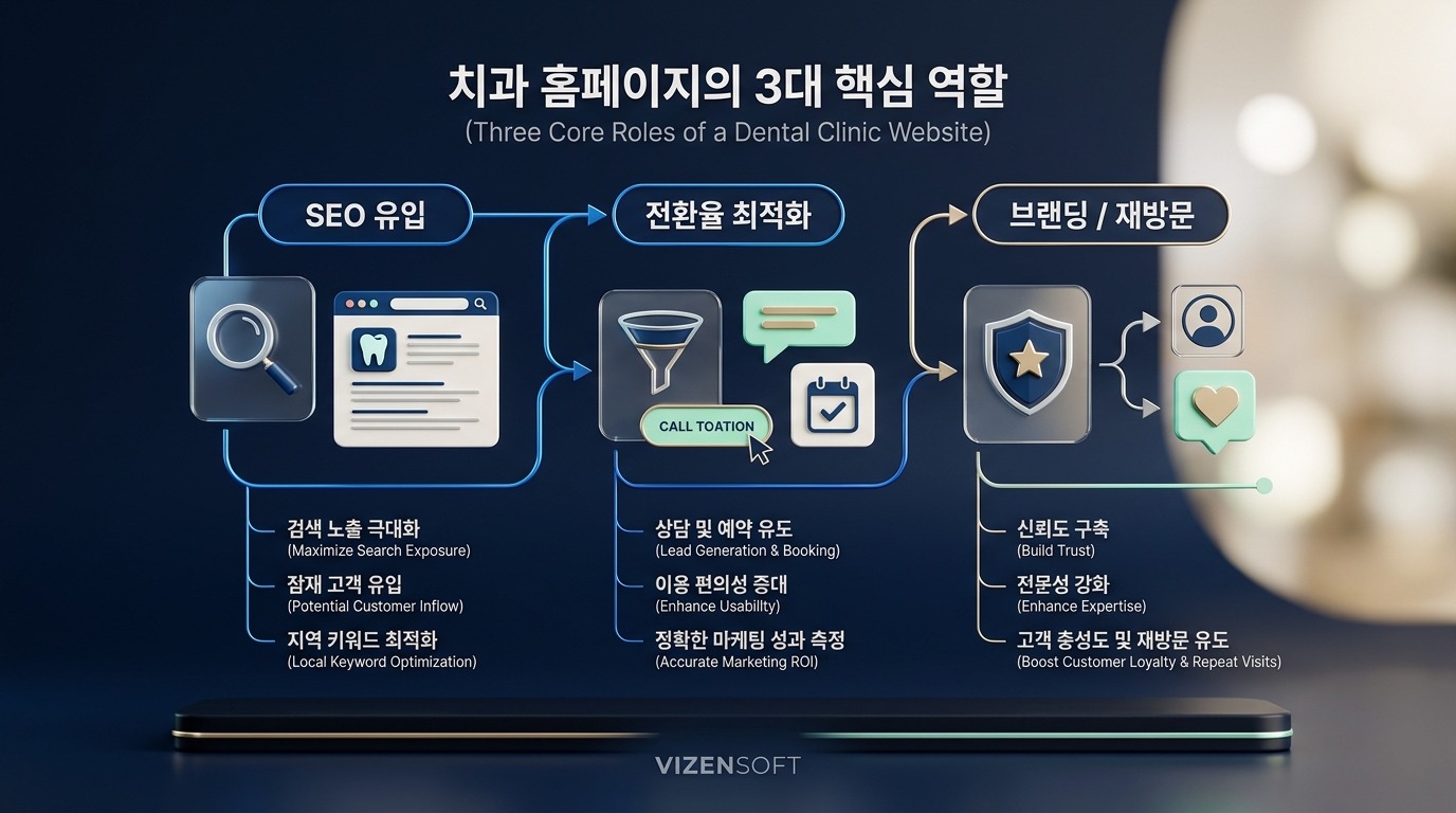 치과 웹사이트가 해야 할 일은 크게 세 가지입니다. 첫째, 검색엔진에서 상위에 노출되어 잠재 환자를 끌어오는 SEO 역할. 둘째, 방문한 사람이 이탈하지 않고 예약으로 전환되도록 설계된 CRO(전환율 최적화) 역할. 셋째, 기존 환자가 재방문하고 지인에게 추천하도록 만드는 브랜딩 역할. 이 세 가지가 균형 있게 구현된 홈페이지가 바로 '돈 버는 치과 홈페이지'입니다. 그리고 이 세 가지를 동시에 만족하는 홈페이지는 단순한 템플릿 솔루션이 아닌, 치과의 비즈니스 구조와 환자 여정을 깊이 이해한 커스텀 개발을 통해서만 완성될 수 있습니다.